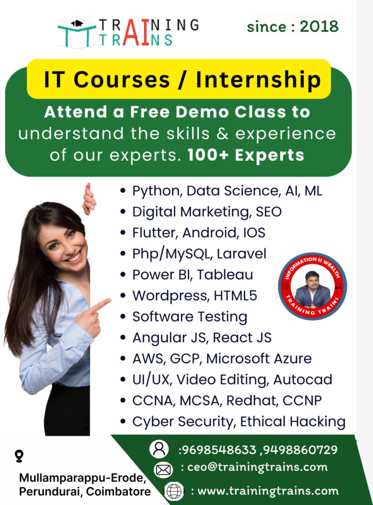 Upon successful completion of the internship training program at Training Trains in Erode, participants are awarded industry-recognized certifications. These certifications validate the skills and knowledge gained during the training and serve as a testament to the participant’s proficiency in their respective field.